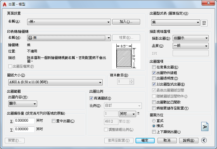 若要建立新頁面設置,請按一下「新建」並輸入新頁面設置的名稱。然後會顯示一個類似於「出圖」對話方塊的「頁面設置」對話方塊。選擇所有要儲存的選項和設定。