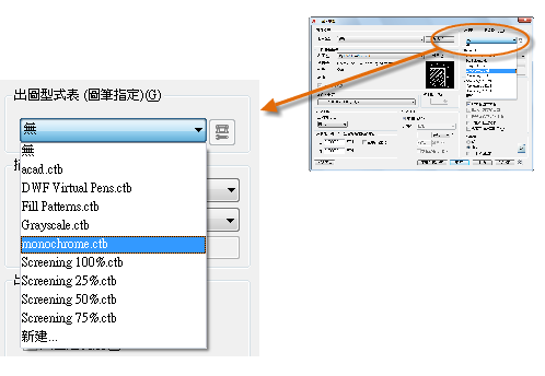 出圖型式表可提供有關處理顏色的資訊。在顯示器上正常顯示的顏色可能不適用於 PDF 檔或列印。例如,您可能想要建立單色輸出的彩色圖面。以下是指定單色輸出的方法: