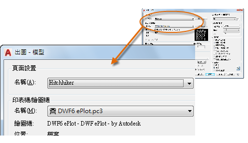 當準備出圖時,您只需在「出圖」對話方塊指定頁面設置的名稱,然後所有出圖設定將會還原。在以下插圖中,「出圖」對話方塊設定為使用 Hitchhiker 頁面設置,而這會輸出 DWF (Design Web Format) 檔,而不是列印至繪圖機。