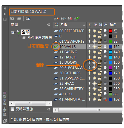 在標示「開啟」的欄之中,請注意兩個圖層的「燈泡」圖示是暗的。這些圖層已經關閉以隱藏樓板平面圖中的門和電線。