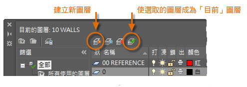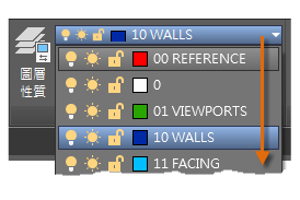 如您在圖中所見,圖層 10 WALLS 是目前圖層。所有新物件都會自動放置在該圖層上。圖層的清單中,10 WALLS 旁的綠色勾選會確認其為目前的圖層。