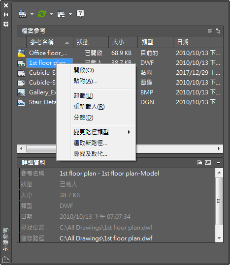如果您選取的要編輯的參考已貼附外部參考或圖塊定義,則在「參考編輯」對話方塊中會顯示此參考及其巢狀式參考,並可以選取它們。只有在選取的選擇物件是套疊參考的一部分時,套疊參考才會顯示出來。一次只能選取一個參考來編輯。如果您在編輯含有 OLE 物件的參考,將顯示 OLE 物件,但無法選取它們進行編輯。
