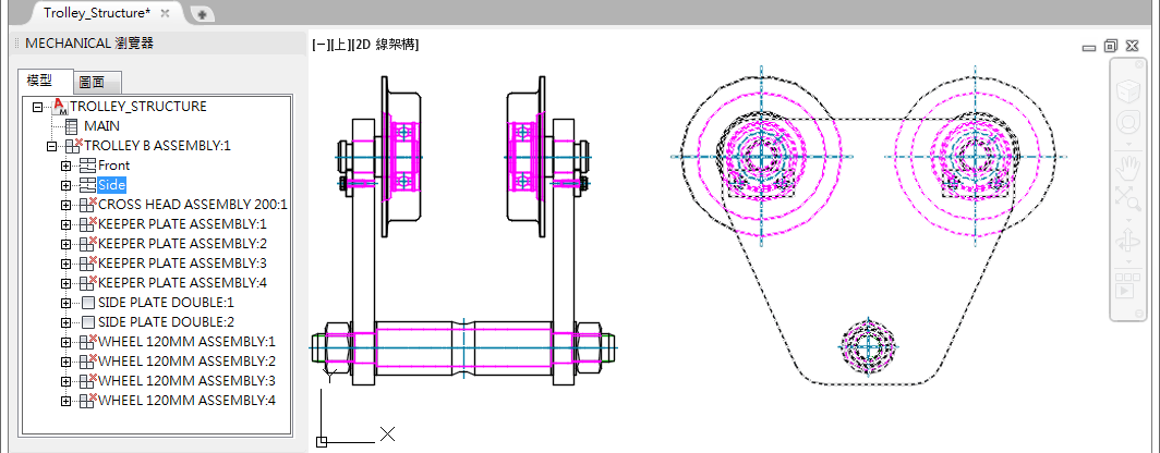 您也可以使用瀏覽器上的右鍵功能表,並縮放至模型空間中的元件視圖或資料夾幾何圖形。如果在圖面中多次重複使用元件視圖或資料夾,則可以在元件視圖或資料夾的某個例證上按一下右鍵,然後選取「尋找所有例證」。這將選取 (並亮顯) 模型空間和 Mechanical 瀏覽器中此元件視圖或資料夾的所有複本。