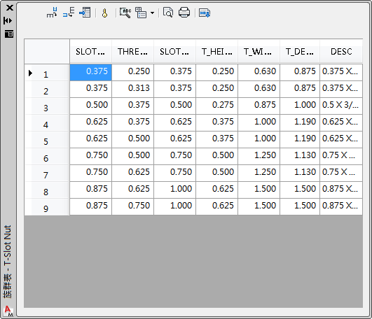 將欄放置到適當位置後,指定要用作關鍵欄的欄。關鍵欄是族群表中用來唯一識別列的欄的組合。例如,螺釘的標稱直徑、節距和標稱長度組合在一起來唯一定義其大小。因此,在族群表中,可選取相應的欄做為關鍵欄。設定為關鍵欄的欄顯示在「大小選取」對話方塊「事先定義的參數」區段的清單檢視和樹狀檢視中。在表格檢視中,AutoCAD Mechanical toolset 會顯示已選取「顯示在『大小選取』對話方塊中」選項的所有欄。