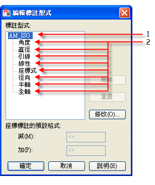 與製圖標準相關聯的標註型式包含為該標準定義標註基本設定的基準標註型式 (插圖中的 1),以及明確為不同標註類型定義型式的次型式 (插圖中的 2)。在多數情況下,次型式與基準型式相同。在某些情況下,當要求在標註類型上強制執行唯一特性時,此標註的預設設定至少有一個設定與基準標註型式不同。