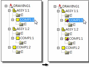 此範例展示包含 ASSY1 組合的兩個例證 (ASSY1:1 與 ASSY1:2) 的圖面。COMP1 同時出現在 ASSY1 內部 (COMP1:2) 和外部 (COMP1:1)。如果您選取 ASSY1:1 中的 COMP1:2,並使其做為參考元件,則 ASSY1:2 中的 COMP1:2 也將成為參考元件。這是因為例證 COMP1:2 會出現兩次,一次在 ASSY1:1 中,一次在 ASSY1:2 中。但是,例證 COMP1:1 不會成為參考元件。