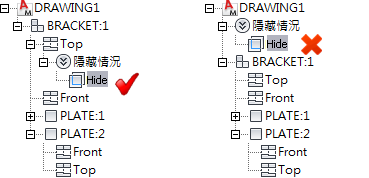 在啟用了 Mechanical 結構的圖面中,隱藏情況在 Mechanical 結構中的位置十分重要。