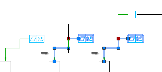 當您掣點編輯主要引線時,掣點之前的引線線段 (朝向箭頭所指方向) 將進行拉伸或收縮。其他引線不受影響。特徵控制框的位置會相應變更。