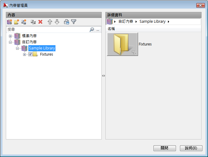即可建立資源庫。建立資源庫時,需要指定檔名和圖庫的位置。AutoCAD Mechanical toolset 會直接在左側樹的「自訂內容」節點下方新增資源庫。然後,您可以建立資料夾,以如同處理標準圖庫一樣組織並分類內容。將資料夾移動到樹的上方,您可以更輕鬆地存取常用內容。