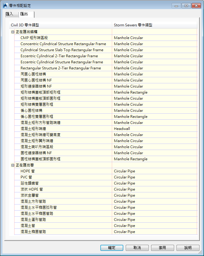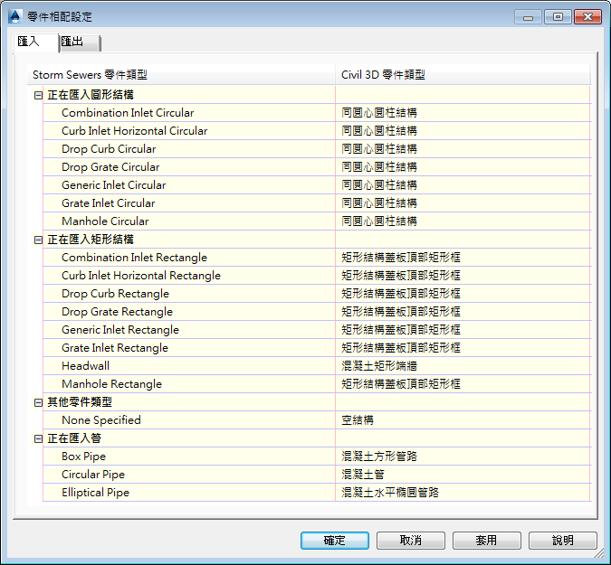 「匯入」頁籤可讓您選取 Autodesk Civil 3D 零件族群 (右側),用於每個可用的 Storm Sewers 零件類型。Storm Sewers 零件類型為固定清單。此對映應等於匯出對映,以便零件族群保持不變。