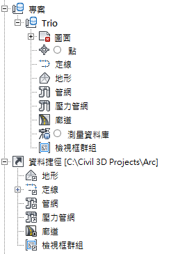 圖中展示了名為 Trio 的 Vault 專案的集合和名為 Arc 的資料捷徑專案的集合。兩個專案類型均是從預設的專案樣板建立的。因此,它們具有完全相同的地形、定線以及其他物件集合,並可以將這些集合做為多個圖面中的參考。