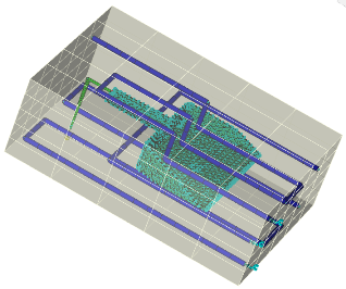 若要執行暫態冷卻分析,除了零件模型之外,您還需要模具模型及其相關聯的冷卻通道、輸送管、障板管等以及其他任何元件 (例如模具嵌入件)。如果您沒有模具模型,可以使用模具塊精靈建立一個。