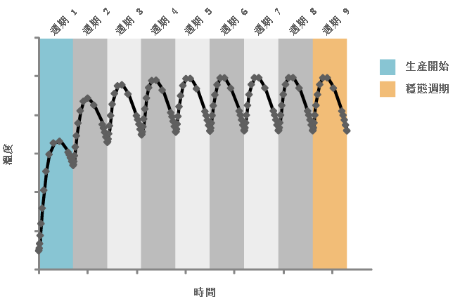 模具在生產開始過程中從一個週期到下一個週期的溫度變化