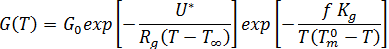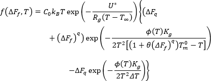未見結晶生成率受材料流動的顯著影響。因此,我們假設生成率僅取決於溫度,並遵循 Hoffman-Lauritzen 理論[1]: