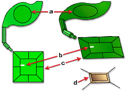 下圖展示已針對「微晶片封裝」分析準備的模型範例。圖中展示釜 (a)、流道、金線 (b)、晶片母模仁 (c) 與導線架 (d)。左邊是上視圖。右邊是斜視圖。