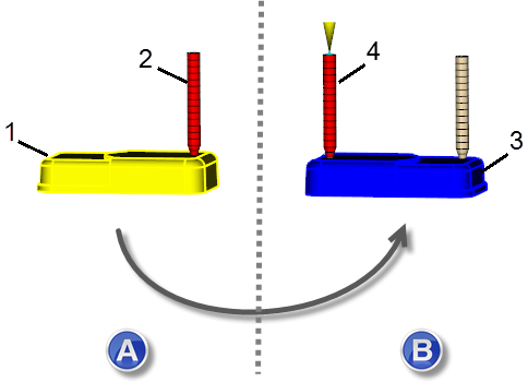 由於模具在雙色成型製程期間會旋轉,因此您必須指定第一個元件在第一次射出期間的位置 (A),以及在第二次射出期間的位置 (B)。