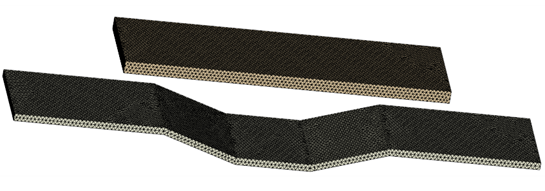 您可以建立剛性或彈性的初始聚合物負載。剛性初始負載在分析開始時會維持其原始造型,然後在壓縮期間會一直符合以充填母模仁。彈性初始聚合物負載則會在壓縮開始時下降並覆蓋母模仁的空間。負載在壓縮開始時符合母模仁造型的程度,取決於零件幾何圖形,以及零件與初始負載兩者的網格密度。網格密度越大,初始負載就越符合母模仁造型,但分析也需要花費越久的時間。