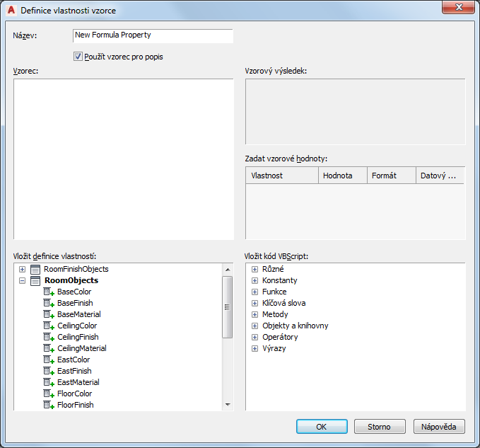 Názvy definic vlastností, použité ve vzorci, jsou zobrazeny v závorkách, například [Šířka]. Pokud definice vlastnosti náleží do jiné definice sady vlastností, než je definice obsažená ve vzorci, je tento název rovněž zobrazen, například [DoorObjects:Výška].