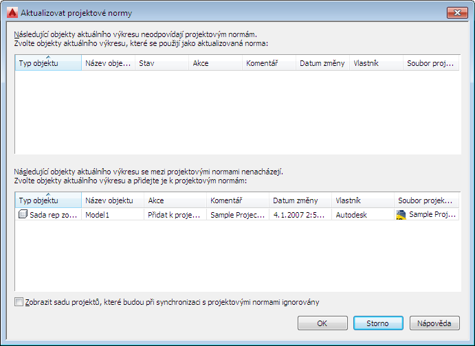 V tomto případě nestandardizované nastavení zobrazení nebude v příštích aktualizacích znovu uvedeno, pokud nenastavíte položku Zobrazit objekty, které budou při synchronizaci s projektovými normami ignorovány nebo neodstraníte příznak Ignorovat z nastavení zobrazení ve Správci zobrazení.
