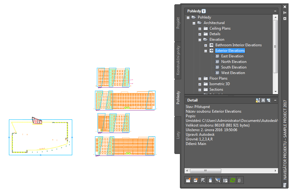 Výkres pohledu se vytváří výběrem konstrukčních prvků na paletě Navigátoru projektu a vytvořením reference na tyto prvky ve výkresu pohledu. Pokud vytváříte pohledy s více hladinami, každý konstrukční prvek je odkazován ve své relativní výšce hladiny, kdy nejnižší hladina je vložena na Z = 0.