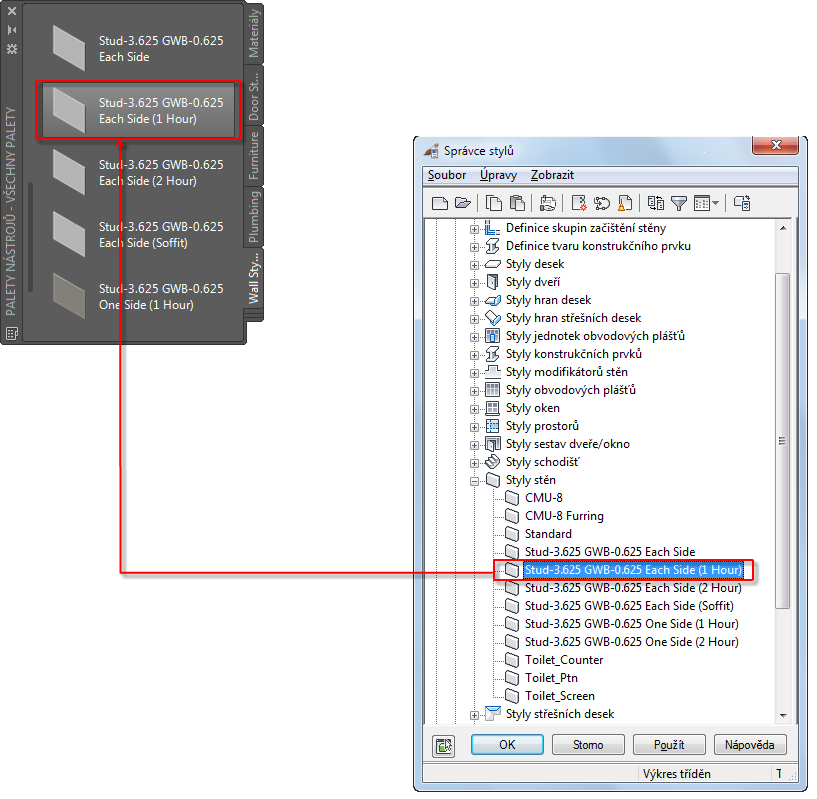 . Pokud chcete například vytvořit nástroj stěny se stylem Hrázděná-3,625 sádrokartón-0,625 každá strana (1 hodina), rozbalte položku Styly stěn a vyberte styl Hrázděná-3,625 sádrokartón-0,625 každá strana (1 hodina).