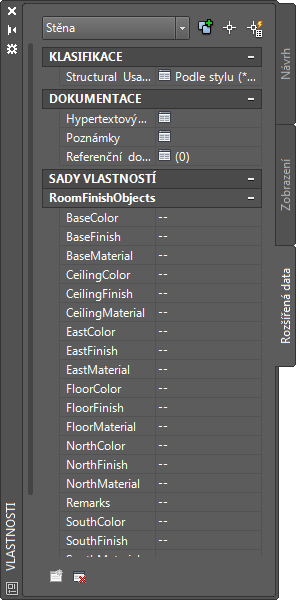 Poznámka: Výpis definice sady vlastností na kartě Rozšířená data se dá ovládat pomocí možností v rozevíracím seznamu Přepsání vlastnosti na kartě Nastavení objektu AEC v dialogu Možnosti.