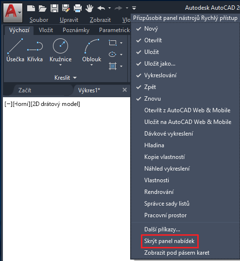 panelu nástrojů Rychlý přístup na rozevírací seznam