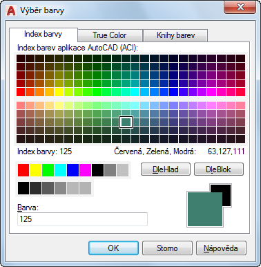 Barvy můžete vybrat z 255 barev indexu barev aplikace AutoCAD (ACI), z barev True Color a z knihy barev, dostupných na třech kartách.