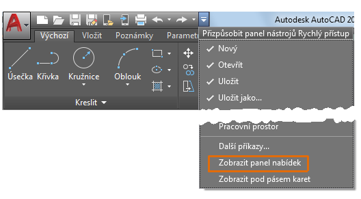 Panel nabídek lze povolit v rozevíracím seznamu na panelu nástrojů Rychlý přístup nebo pomocí příkazu CUI sloužícího k přizpůsobení uživatelského rozhraní.