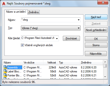 Typ souborů k vyhledávání je závislý na poli Typ, takže v poli Pojmenované nemusíte zadávat příponu souboru. Například chcete-li najít soubor budova102.dvg, zadejte budova* a nastavte Typ výkresu (*.dvg).