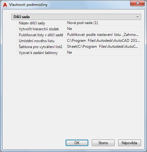 Určuje soubor výkresové šablony (DWT) a název rozvržení, který je použit při tvorbě nových výkresových souborů v této podsadě.