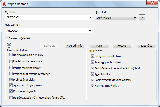 Nastavení Kde hledat určuje, zda se má najít a nahradit text v celém výkresu nebo text v aktuálně vybraném objektu či aktuálně vybraných objektech.
