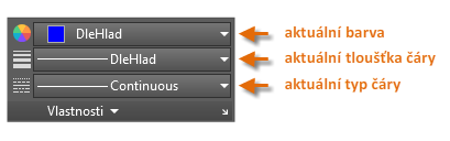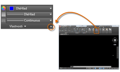 Paleta Vlastnosti je základní nástroj. Je možné ji otevřít pomocí příkazu VLASTNOSTI (v příkazovém okně zadejte zkratku VLA), můžete stisknout kombinaci kláves Ctrl+1, nebo můžete kliknout na malou šipku na panelu Vlastnosti na kartě Výchozí – podle toho, co upřednostňujete.