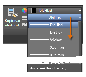 Vlastnost Tloušťka čáry umožňuje zobrazit různé tloušťky vybraných objektů. Tloušťka čar zůstává konstantní bez ohledu na měřítko pohledu. V rozvržení jsou tloušťky čar vždy zobrazeny a tisknuty ve skutečných jednotkách.