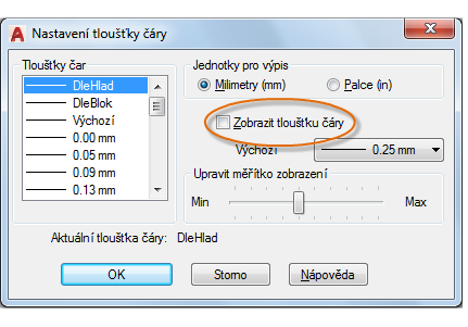 Bez ohledu na nastavení zobrazení budou tloušťky čar vždy tisknuty ve správném měřítku.