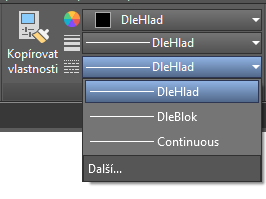 Přerušované čáry a ostatní nesouvislé typy čar jsou přiřazeny z panelu Vlastnosti. Typ čáry je třeba nejprve načíst a teprve potom jej přiřadit.