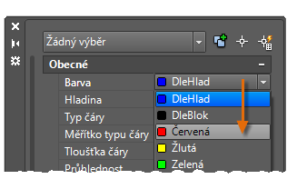 Na paletě Vlastnosti se zobrazuje seznam všech důležitých nastavení vlastností. Kliknutím na libovolné z dostupných polí můžete změnit aktuální nastavení. Pokud nejsou v následujícím příkladu vybrány žádné objekty, změní se nastavení aktuální barvy z možnosti DleHlad na možnost Červená. Všem dále vytvořeným objektům bude poté nastavena vlastnost barvy Červená.