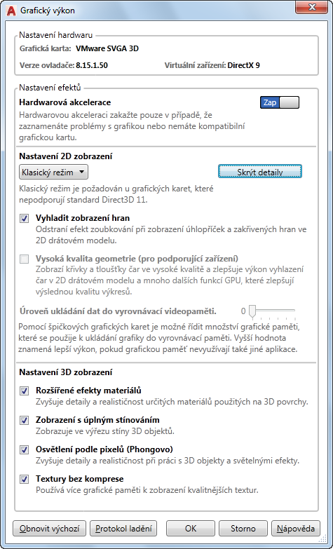 - Umožňuje použití hardwarové akcelerace a umožňuje řídit veškerá nastavení efektů dostupná pro aktuální ovladač. Pokud je vypnuta, je zapnuta pouze možnost Vyhladit zobrazení čar a režim se přepne na výchozí softwarový režim.