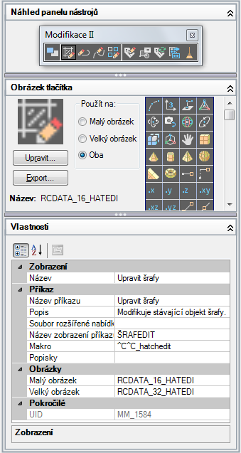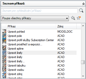 Podokno Seznam příkazů obsahuje všechny příkazy, které jsou k dispozici v aktuálně načtených souborech CUIx. V seznamu můžete vybrat existující příkaz a upravit jeho vlastnosti nebo vytvořit nový příkaz. Jestliže vytvoříte nový příkaz, bude přidán do souboru CUIx, který je zobrazen v rozevíracím seznamu v horní části podokna Uživatelské úpravy: <název souboru>.