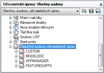 Podokno Uživatelské úpravy slouží k přechodu na různé prvky uživatelského rozhraní, které jsou uloženy v načtených souborech uživatelských úprav.