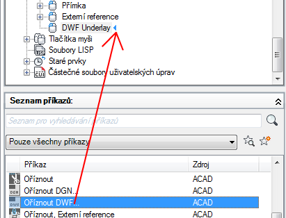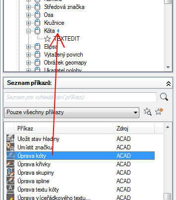 - Pokud chcete nahradit aktuální příkaz přiřazený k akci dvojitého kliknutí, přetáhněte příkaz z podokna Seznam příkazů na akci dvojitého kliknutí v podokně Uživatelské úpravy: <název souboru>.
