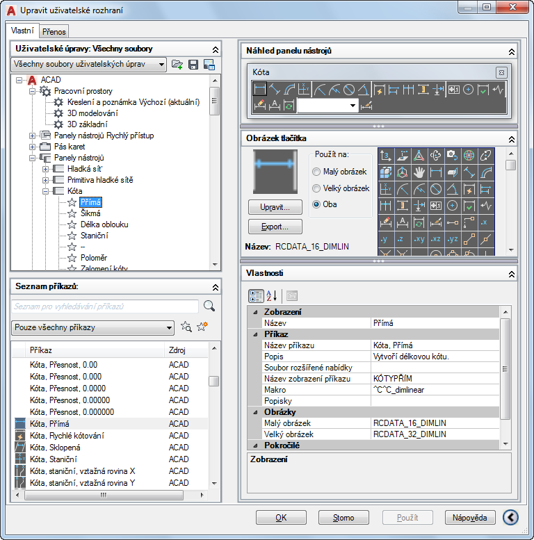 Malý obrázek –·Určuje, že při přidání příkazu do panelu nástrojů, nabídky nebo panelu pásu karet bude použit malý obrázek.