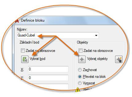 Místo vytvoření výkresového souboru, který má být vložen jako blok, je vhodné vytvořit definici bloku přímo v aktuálním výkresu. Tuto metodu použijte, pokud blok nemáte v plánu vkládat do nějakého jiného výkresu. V takovém případě k vytvoření definice bloku použijte příkaz BLOK.
