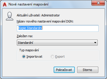 Otevírá dialog Úprava nastavení mapování DGN. V závislosti na vybraném typu mapování (Import nebo Export) se zobrazí odpovídající dialog pro import/export.