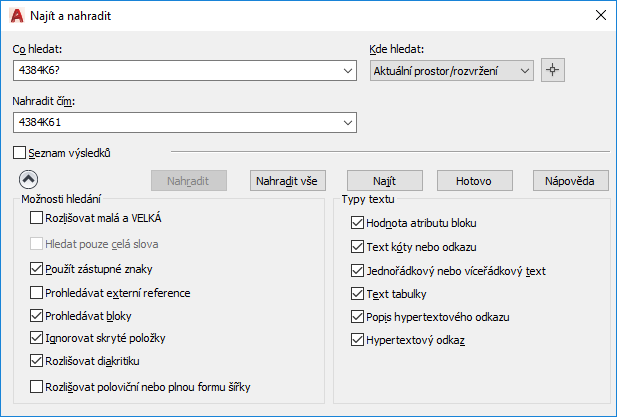 Pokud máte například několik podobných součástí ve výkresu, které je všechny třeba změnit na 4384K61, zadejte výraz 4384K6? do pole Najít a výraz 4384K61 do pole Nahradit.
