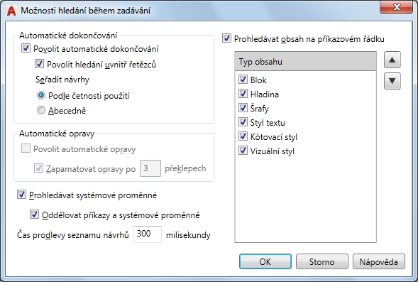 Seznam návrhů příkazového řádku umožňuje rychlý přístup k příkazům, systémovým proměnným a pojmenovaným objektům (obsahu), například blokům, zadáním části jejich názvu na příkazovém řádku. Nastavení určuje, které položky mají být zobrazeny, jejich pořadí, prodlevu před rozbalením seznamu a množství nápovědy poskytované aplikací při zadávání. Také můžete nastavit, zda seznam bude zobrazovat návrhy pouze pro příkazy a obsah začínající písmeny, která napíšete, nebo také pro příkazy a obsah, které tato písmena obsahují (vyhledávání uprostřed řetězce).