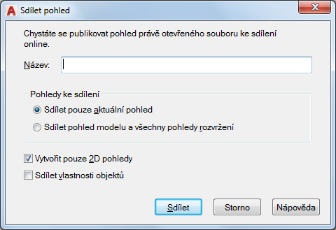 Publikuje reprezentaci aktuálního prostoru nebo celý výkres k prohlížení online a sdílení. Toto usnadní komunikaci a spolupráci s ostatními účastníky bez nutnosti sdílení zdrojových souborů DWG.