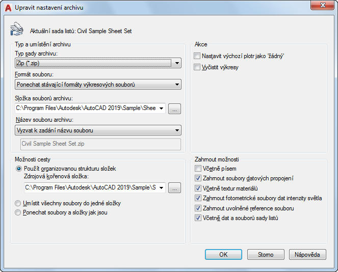 Vloží soubory DST, popisy bloků výkresových souborů, detaily výkresových souborů a soubory šablon výkresu DWT do archivu.