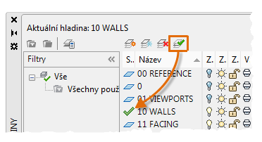 Všechny nové objekty jsou při kreslení vkládány na aktuální hladinu. Zelená značka zatržení ve Správci vlastností hladiny označuje aktuální hladinu.