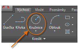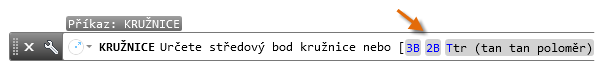 Případně můžete v příkazovém okně zadat příkaz KRUŽNICE nebo jen zkratku KR a kliknutím vybrat požadovanou možnost. V takovém případě můžete určit středový bod, nebo můžete kliknout na jednu ze zvýrazněných možností příkazu, jak je znázorněno dole.
